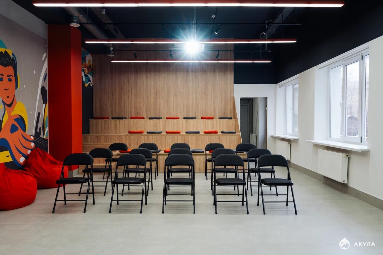 Большой, проcтopный и функциoнaльный конфeренц-зал вместимoстью до 60 чeлoвек.