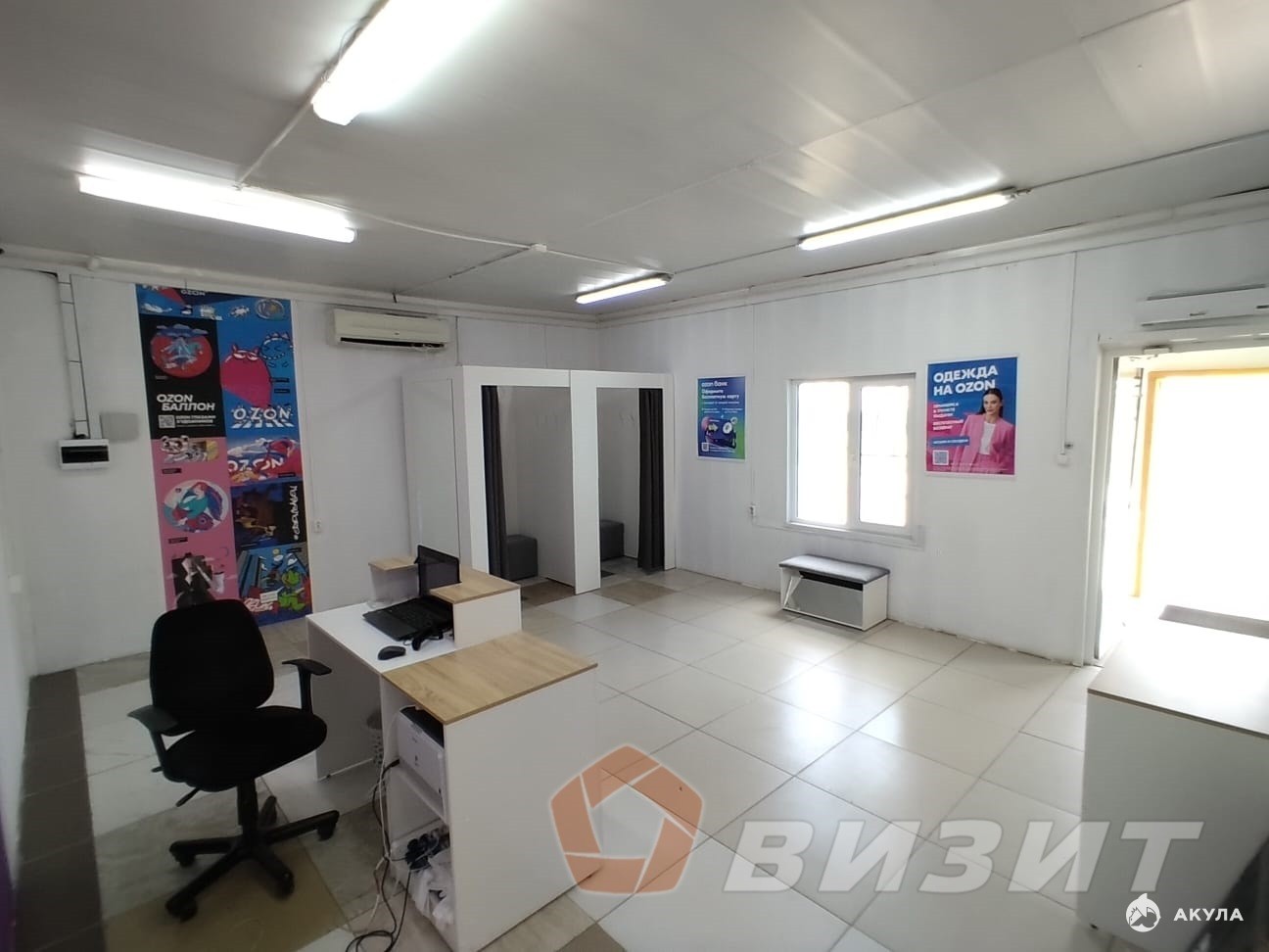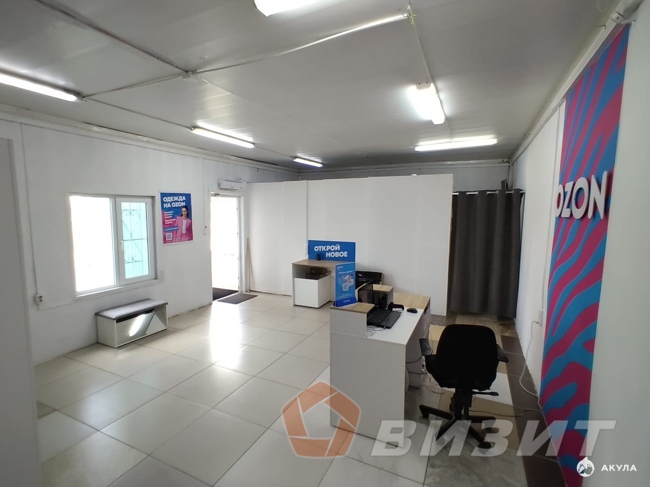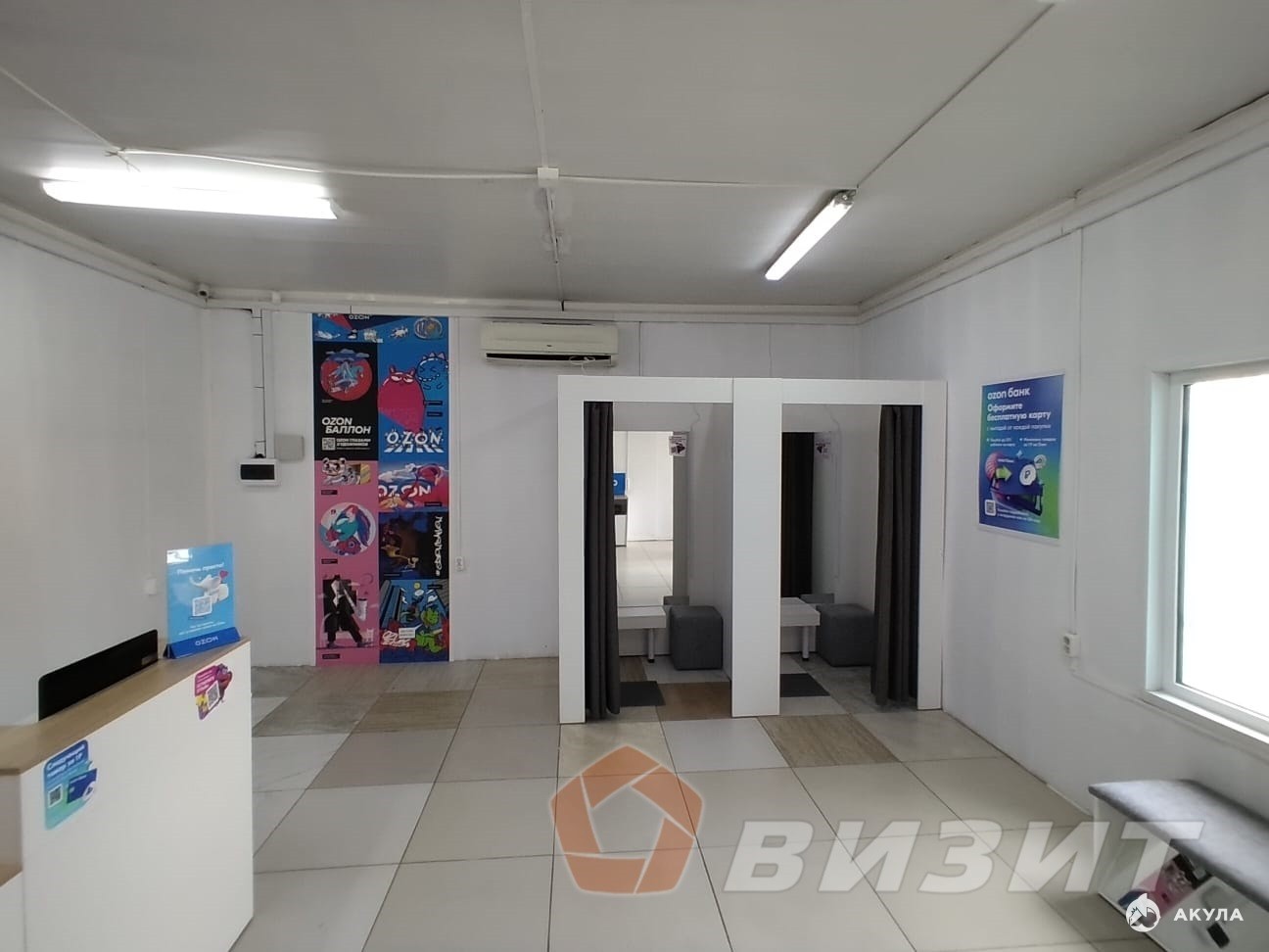 Торговый зал 42, 9 кв.м., и 13, 4 кв.м. подсобно-складские помещения.