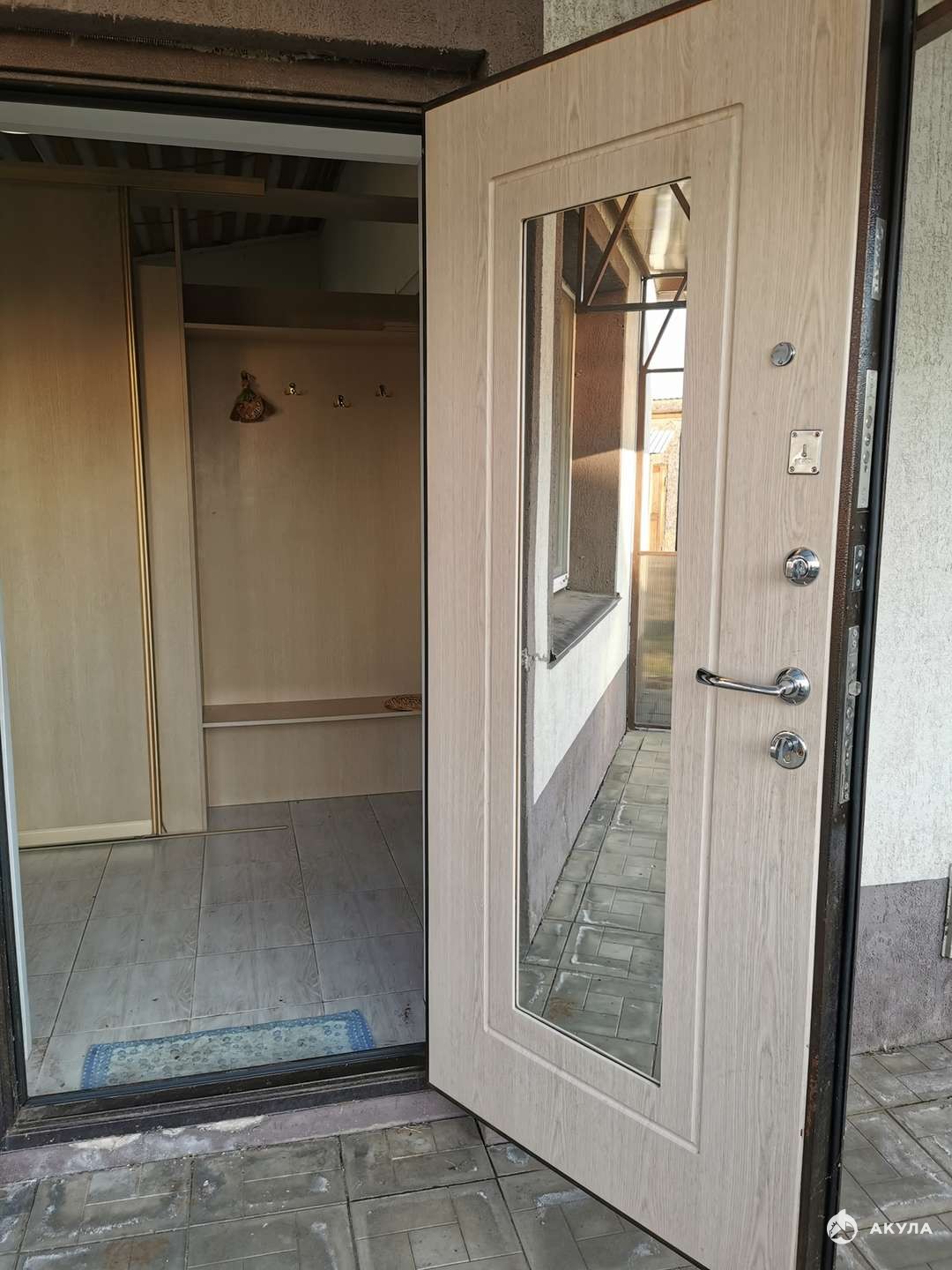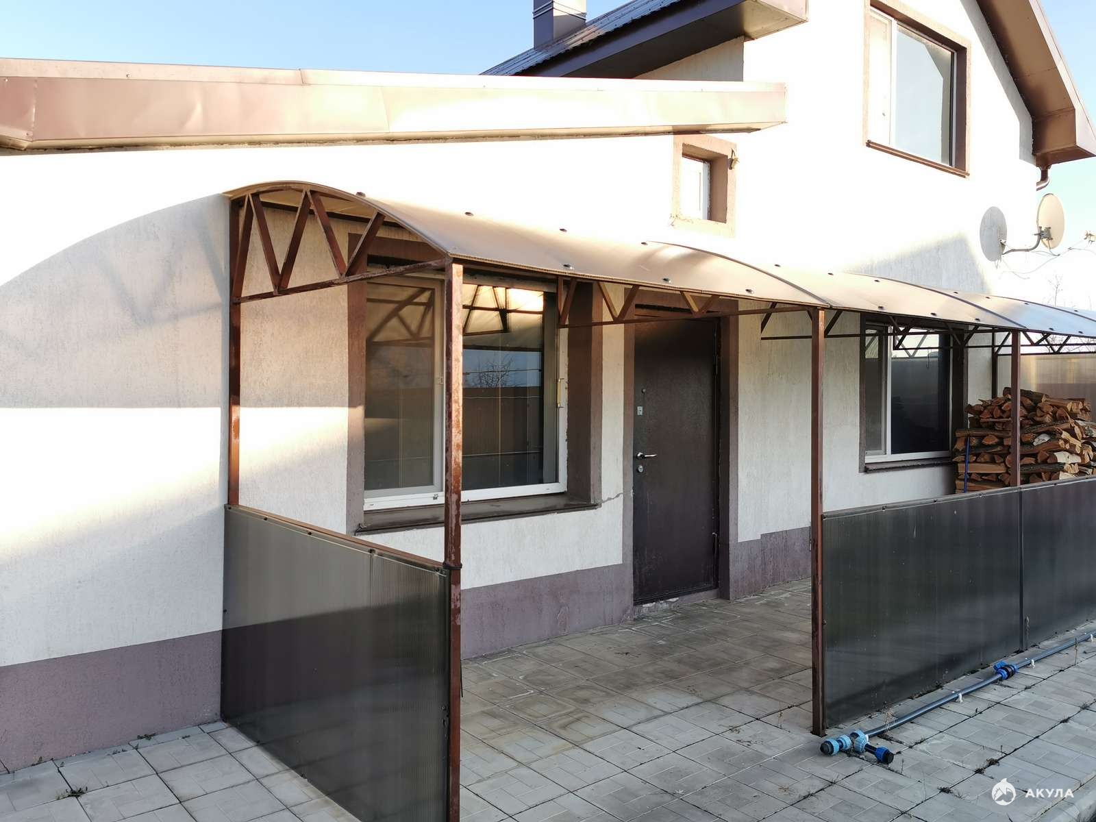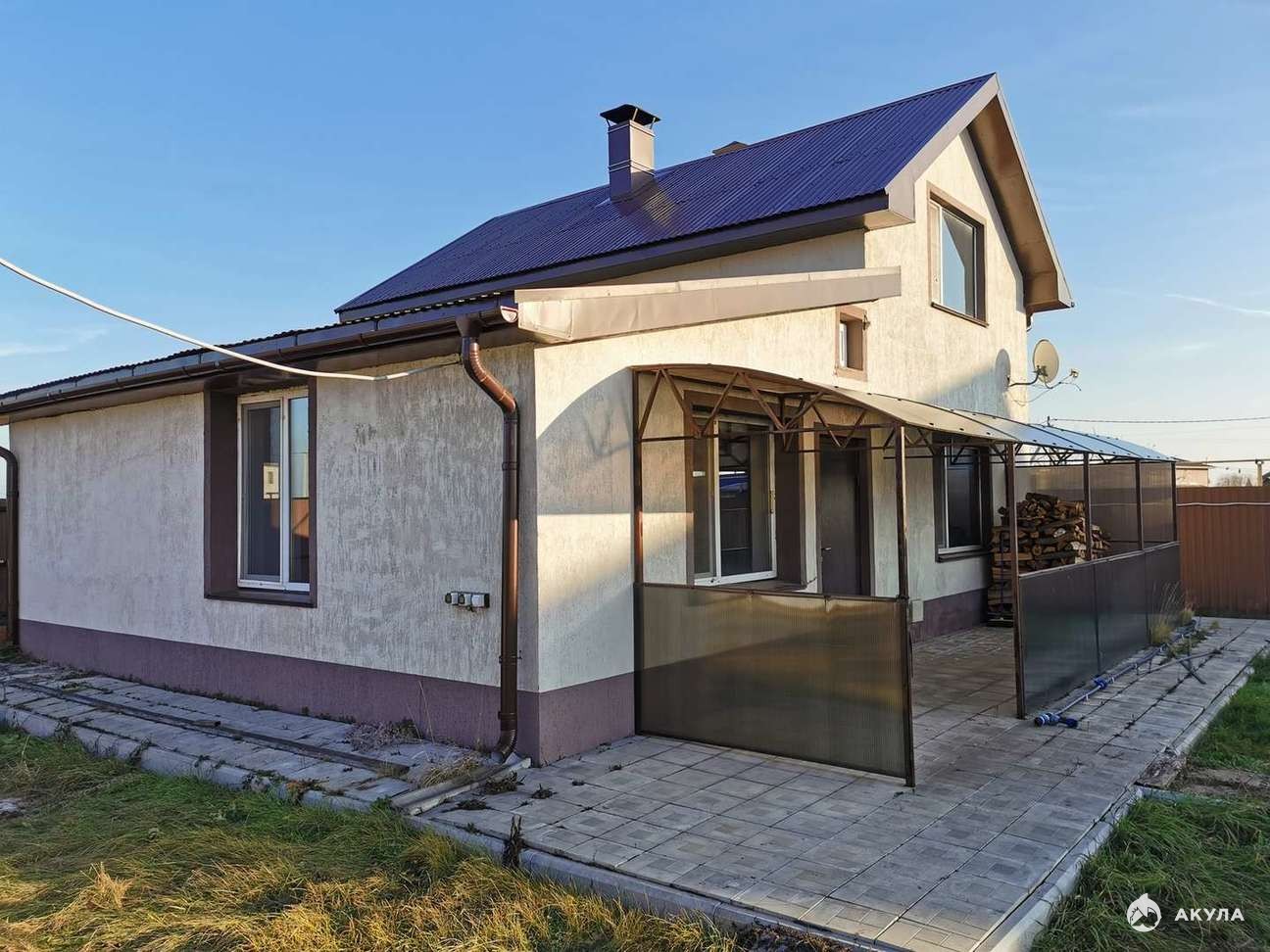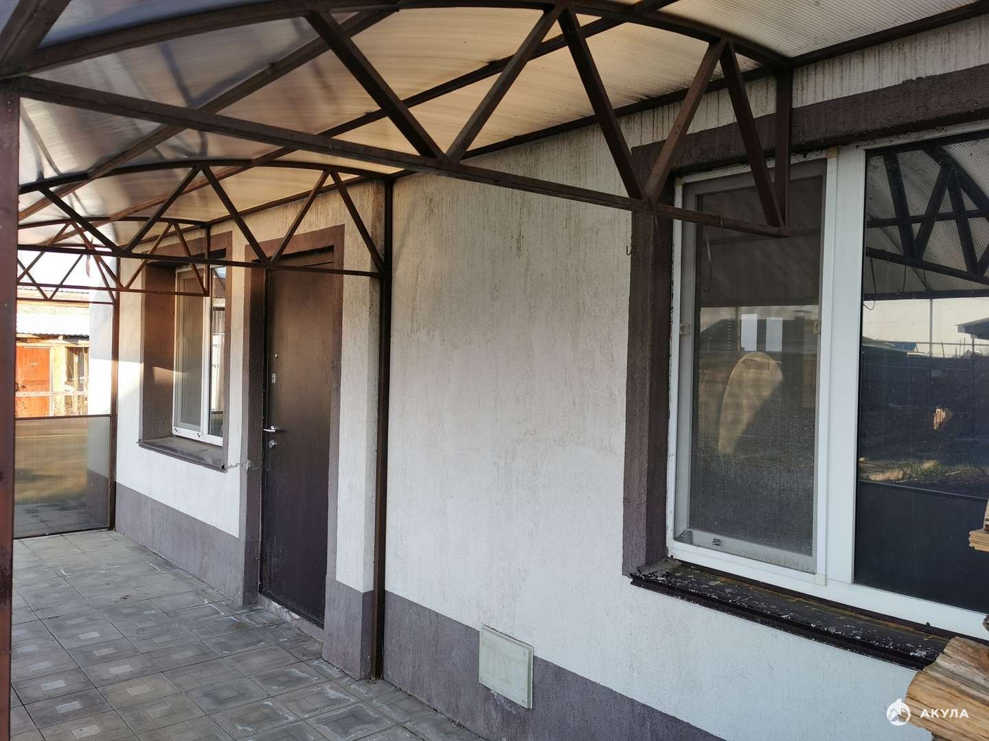 Земли 15 соток. Форма участка квадратная. Есть подсобные постройки. Отдельно стоящая летняя комната отдыха. Навес под машину. Перед домом асфальт. Заезд на участок с двух сторон. Летом с асфальта. Зимой с задней стороны, прямо к дому. Чтобы снег не чистить.