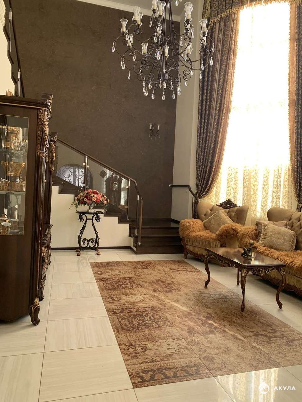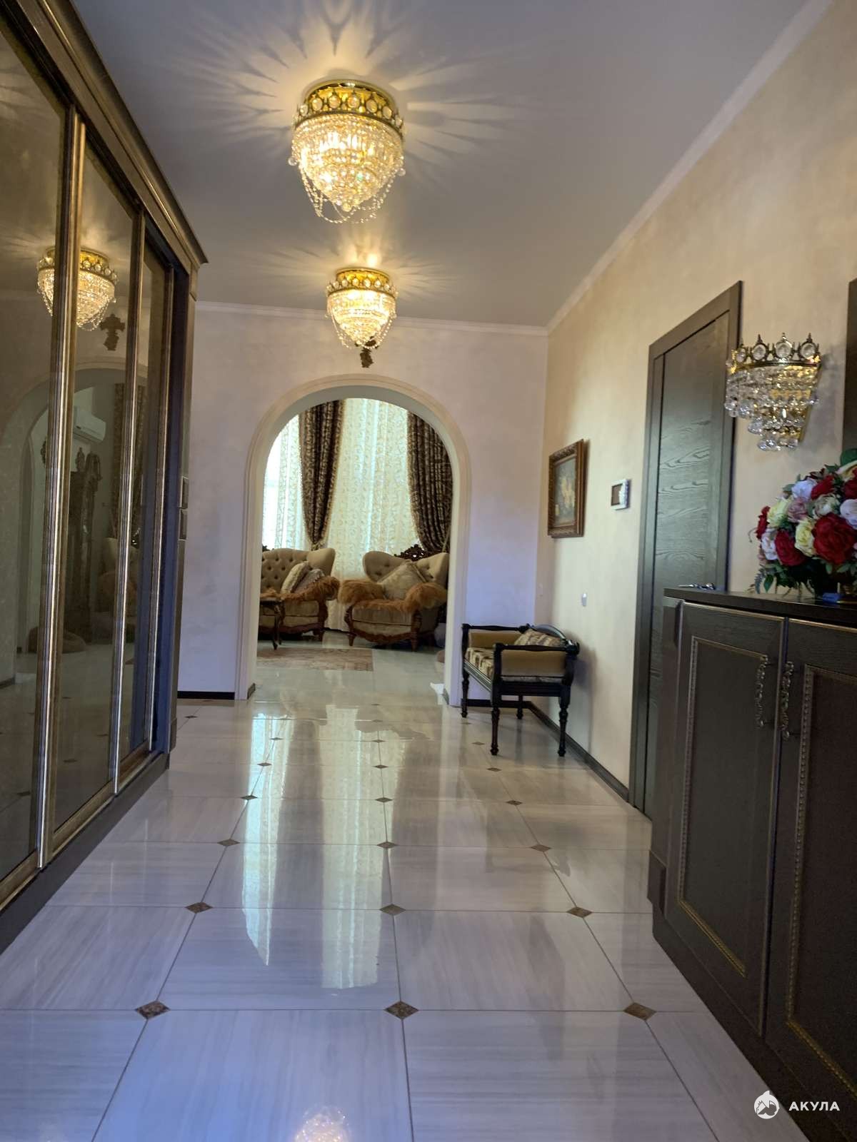 На первом этаже расположены кухня гостиная, а так же великолепный, достойный императоров зал для приёма гостей.
