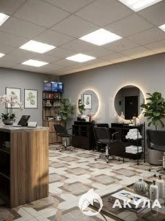 Помещение площадью 50 м² полностью укомплектовано для немедленного начала работы: установлены два парикмахерских кресла, три маникюрных стола и две косметологические кушетки.