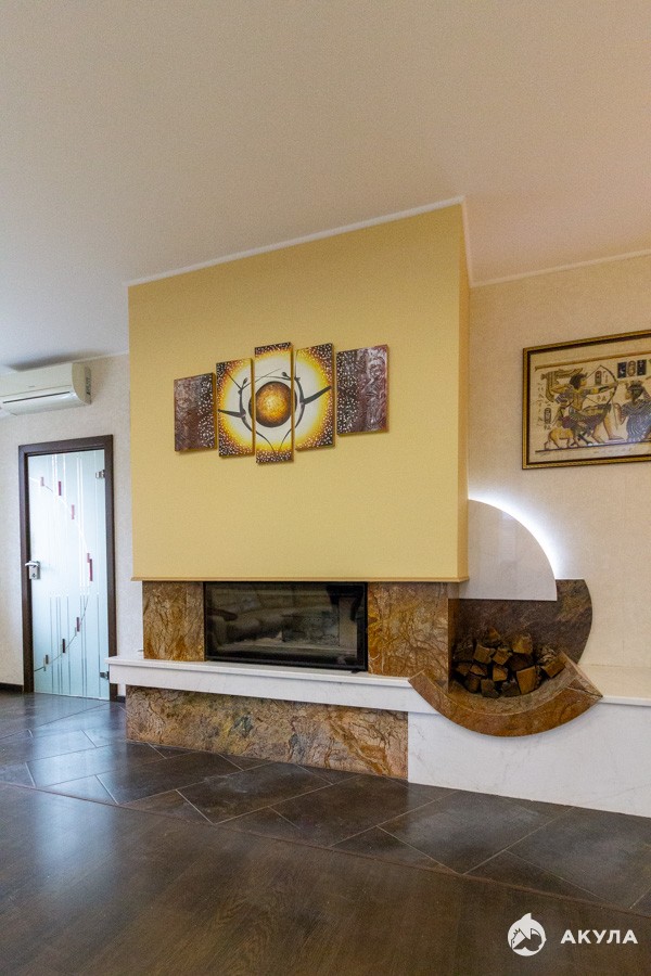- Большой парадный камин в гостиной, декорированный натуральным камнем