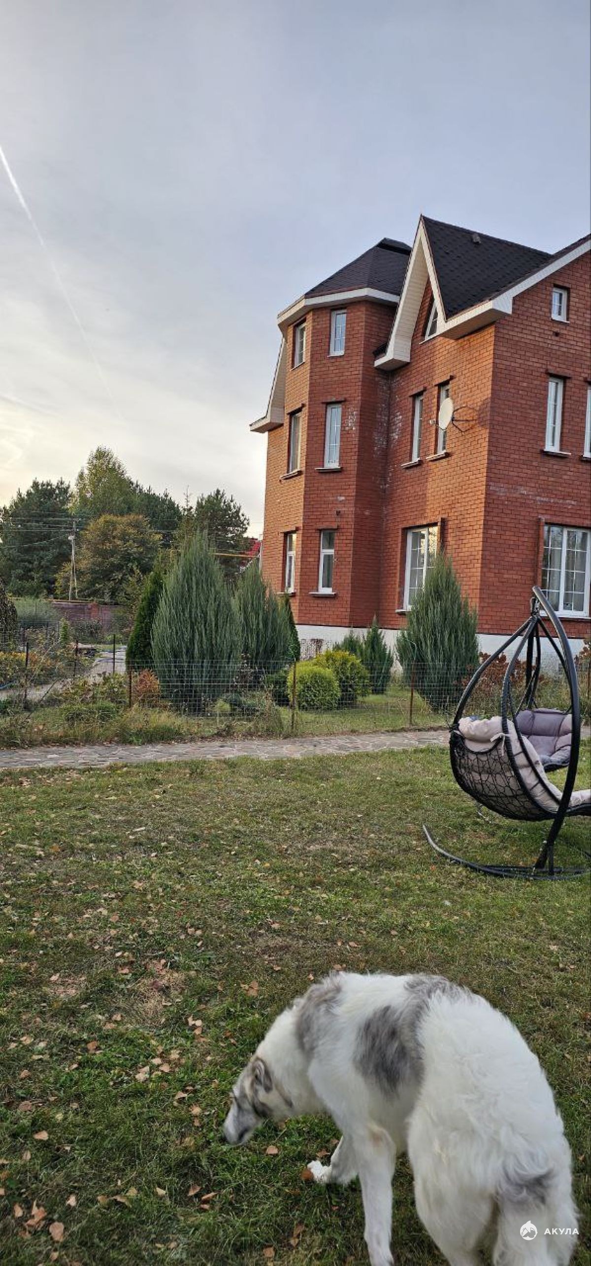 На втором этаже находятся три спальни, два санузла, гардеробная с выходом на террасу. Мансарда свободной планировки. В цокольном этаже три комнаты - подготовка воды и котельная. Во дворе расположен гараж на два автомобиля, баня на дровах, по участку растут туи, елки, можжевельник. Комиссия риэлтору.