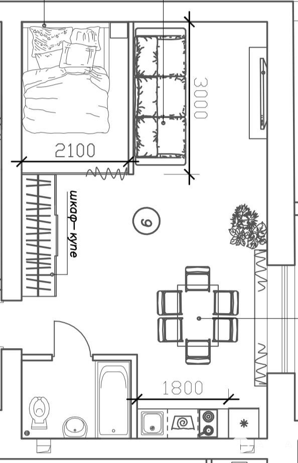 Студия будет передаваться покупателю укомплектованная кухонным гарнитуром со встроенной техникой.