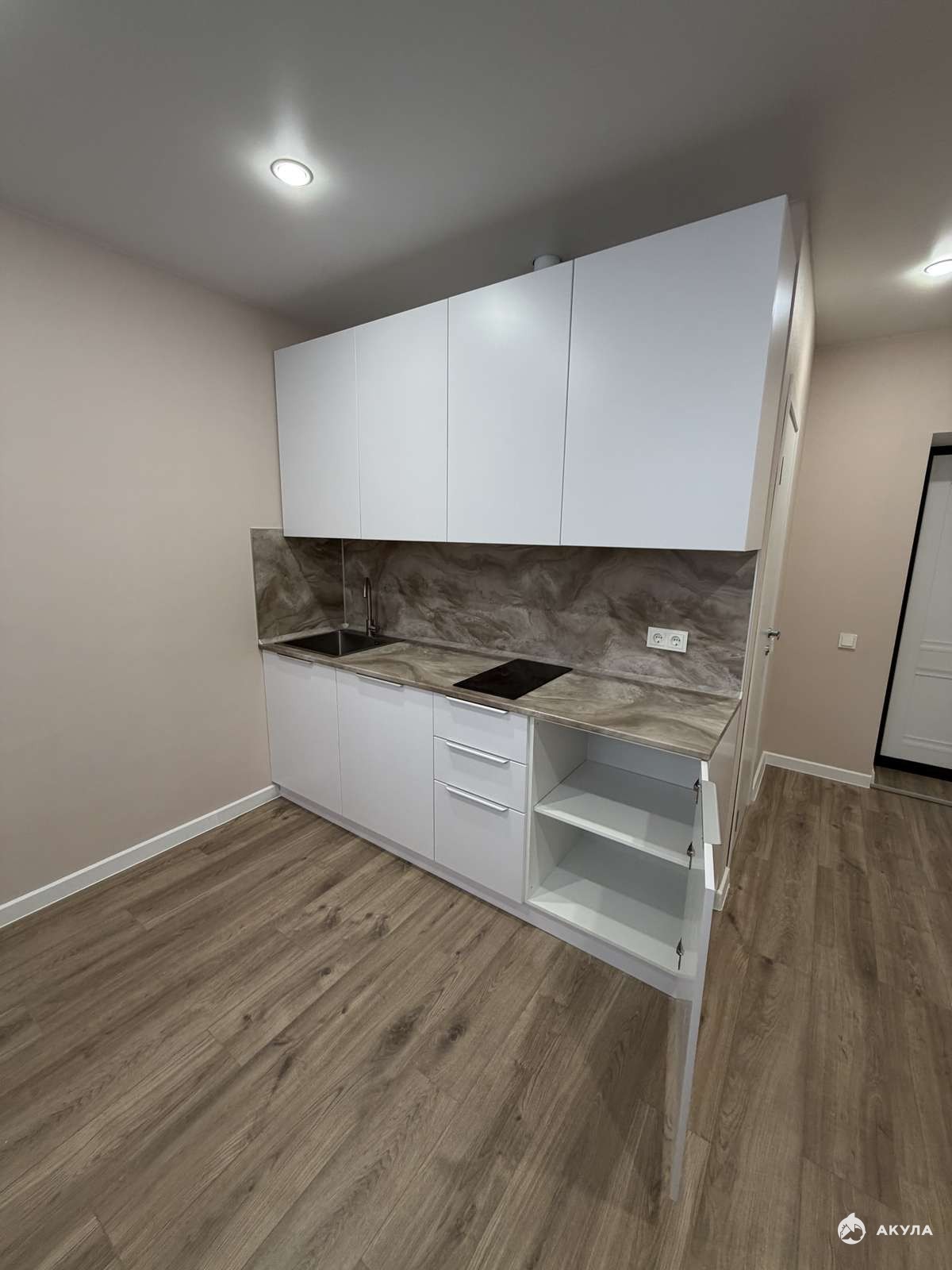 Перед началом проведения отделочных работ в помещении был проведен качественный капитальный ремонт. Стяжка пола, штукатурка стен. Полностью заменены электрика, трубы, обслужены окна. Установлены счетчики на воду горячую и холодную, электричество. Студия укомплектована кухонным гарнитуром со встроенной техникой.