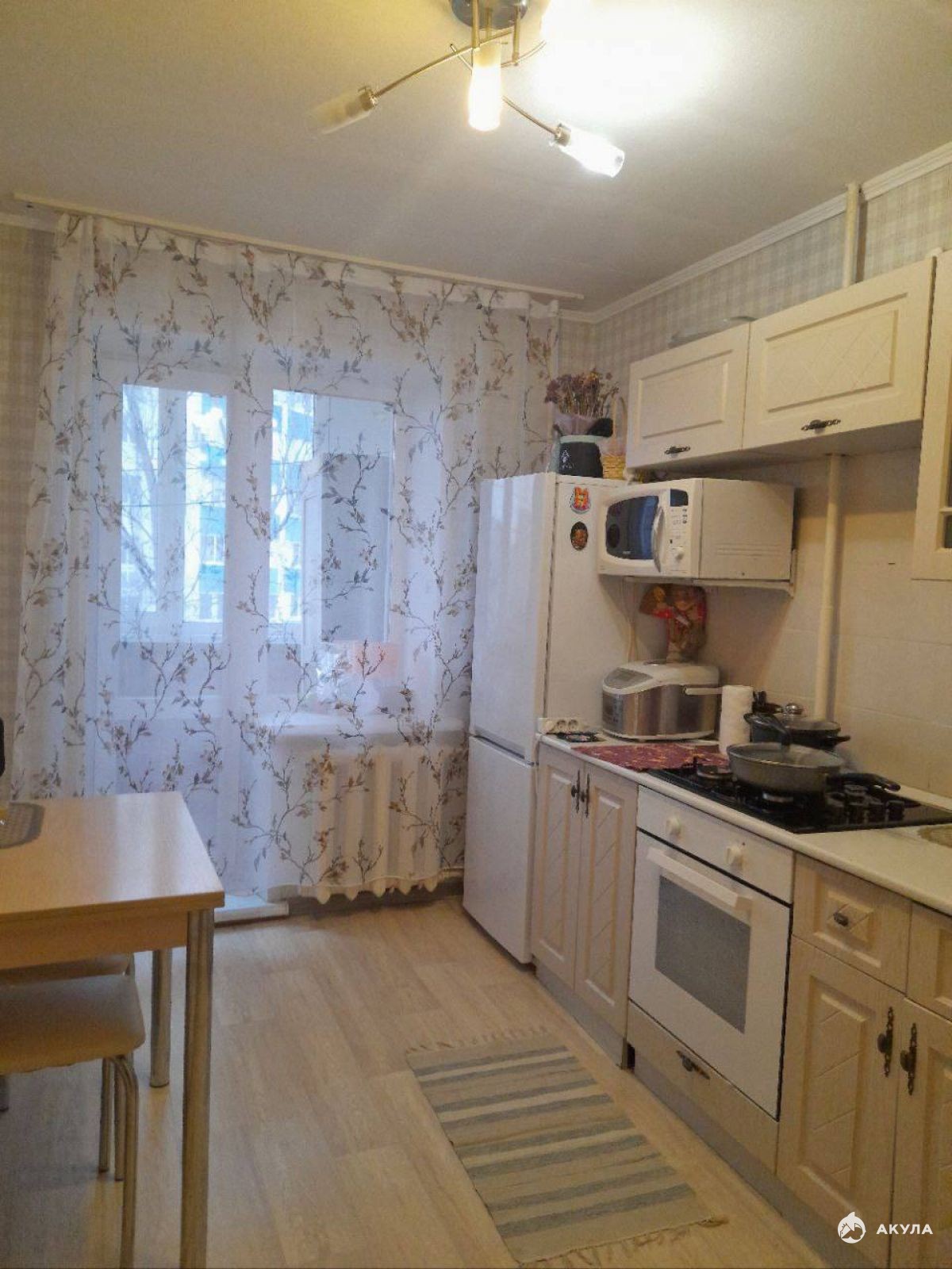 Просторная кухня площадью 9 кв.м. оснащена необходимой бытовой техникой, включая холодильник и стиральную машину. Из окон открывается вид на тихий двор, что обеспечивает спокойствие и уединение.