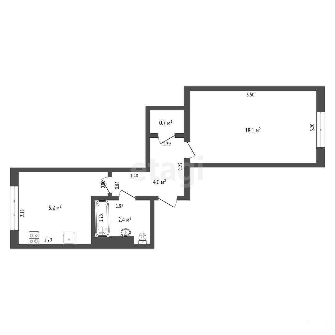 Площадь кухни составляет 5.5 м², что является комфортным показателем для квартиры данного формата, а общая жилая площадь — 18.1 м².