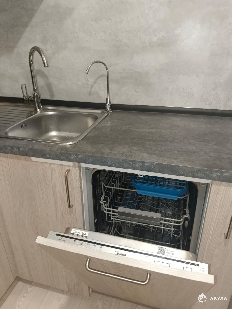 Кухня полностью оборудована : плита, посудомоечная машина, стиральная машина, вытяжка, стол кухонный . В санузле остаются шкафчики .