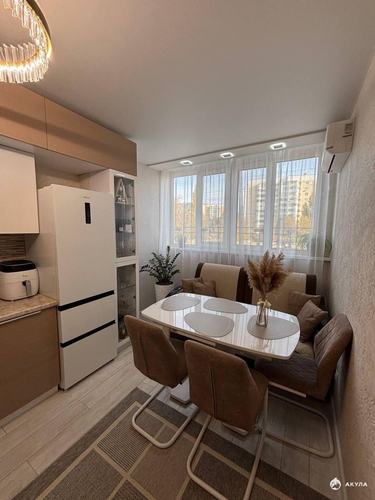 Большая кухня-гостиная 15 м2 присоединили лоджию, просторные комнаты 19 и 16, 5 м2.