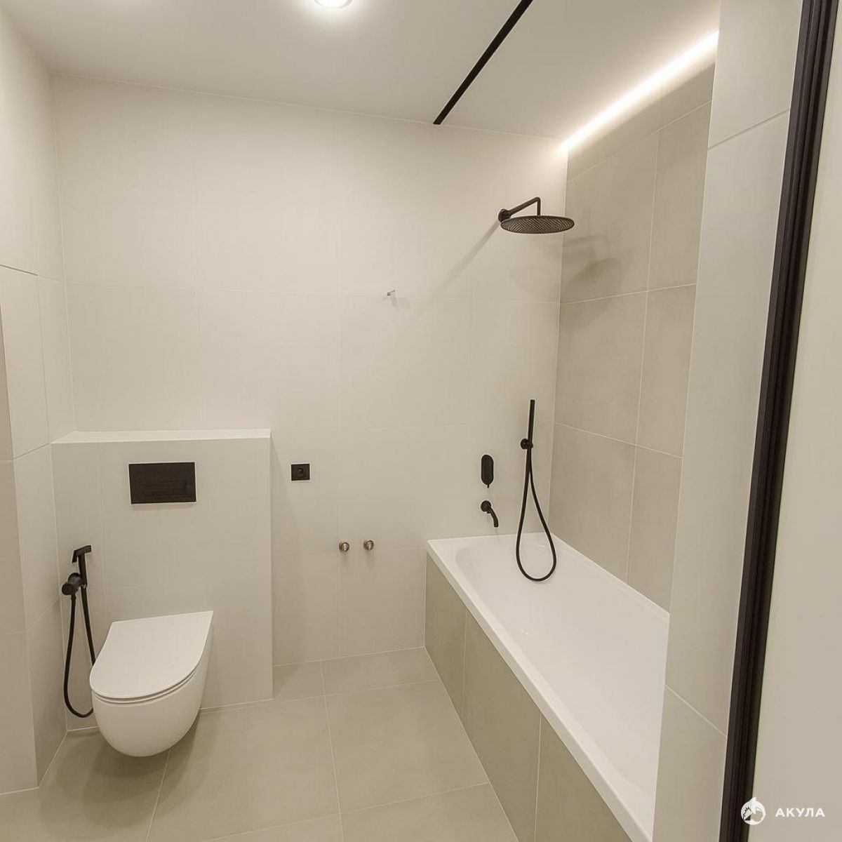 Современный дизайн в светлых тонах, тёплый пол, качественные материалы, продуманное освещение и розетки в каждой зоне.