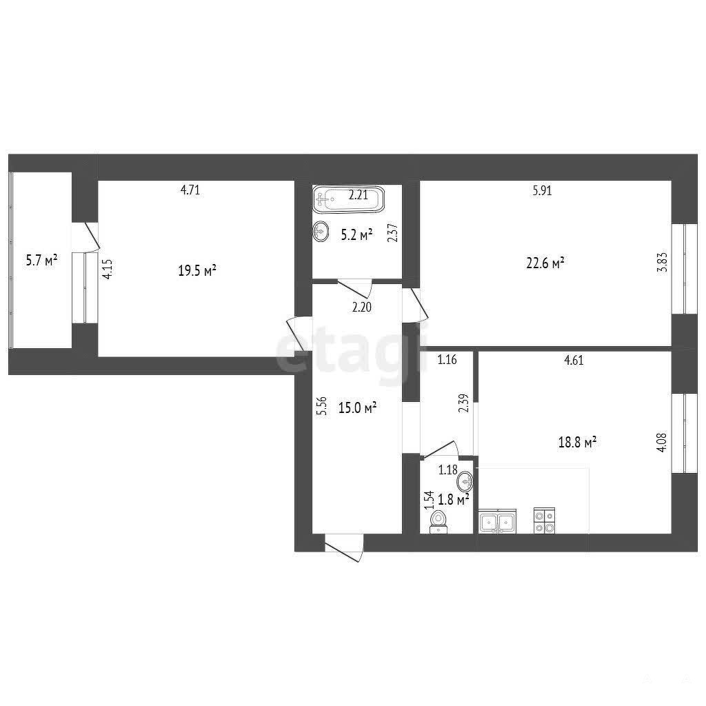 Вас ждет большая кухня-гостиная площадью 18, 8 квадратных метров, где можно собираться с семьей и друзьями, готовить вкусные блюда и наслаждаться общением. Две просторные комнаты площадью 22, 6 и 19, 5 квадратных метров подарят вам возможность создать комфортные спальни или рабочие зоны по вашему вкусу.