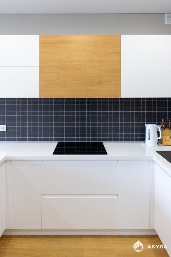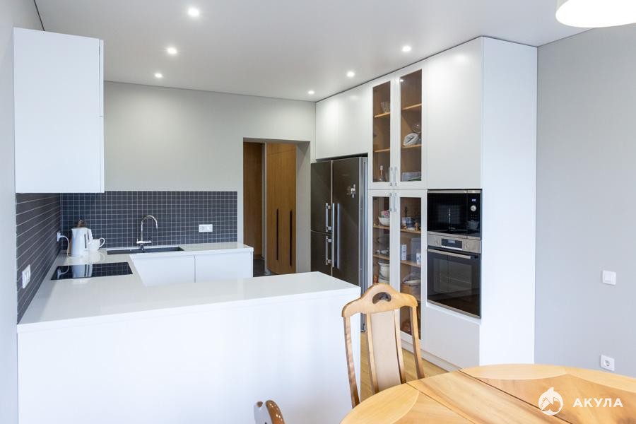 Встроенная кухня от компании ФЭД с фасадами EGGER и цельной столешницей. Полный комплект современной техники Bosch посудомоечная машина, индукционная варочная панель, духовой шкаф, микроволновка. Холодильник и морозильная камера Liebherr, вытяжка и измельчитель пищевых отходов Evolution Insinkerator.