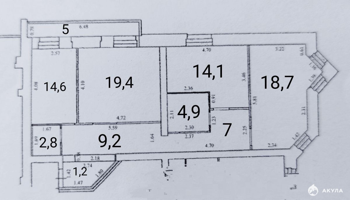 Площадь 91, 6 м2 + балкон 5 м2, 3 раздельные комнаты 19, 4 м2, 18, 7 и 14, 1 м2. Большая кухня 14, 6 м2. Также в квартире предусмотрено 2 с/у.