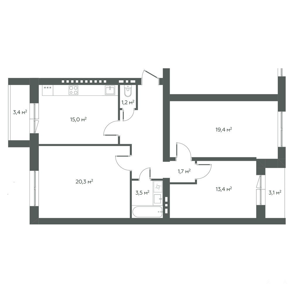 Комнаты 20, 3 + 19, 4 + 13, 4 (с выходом на балкон) кв.м.