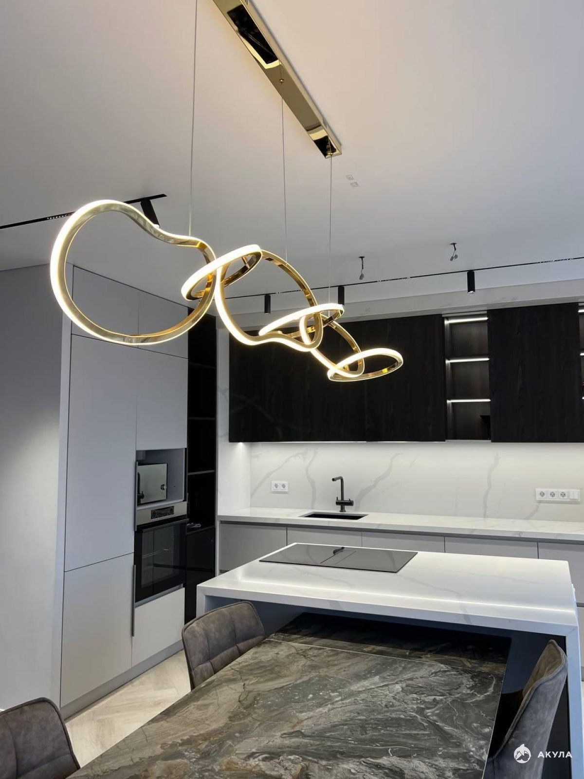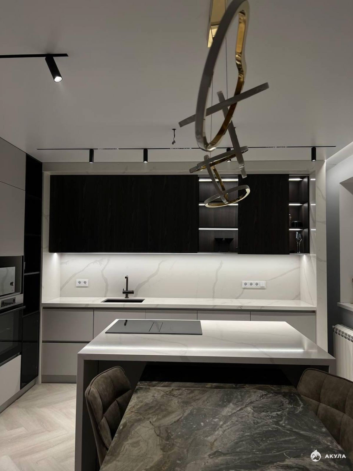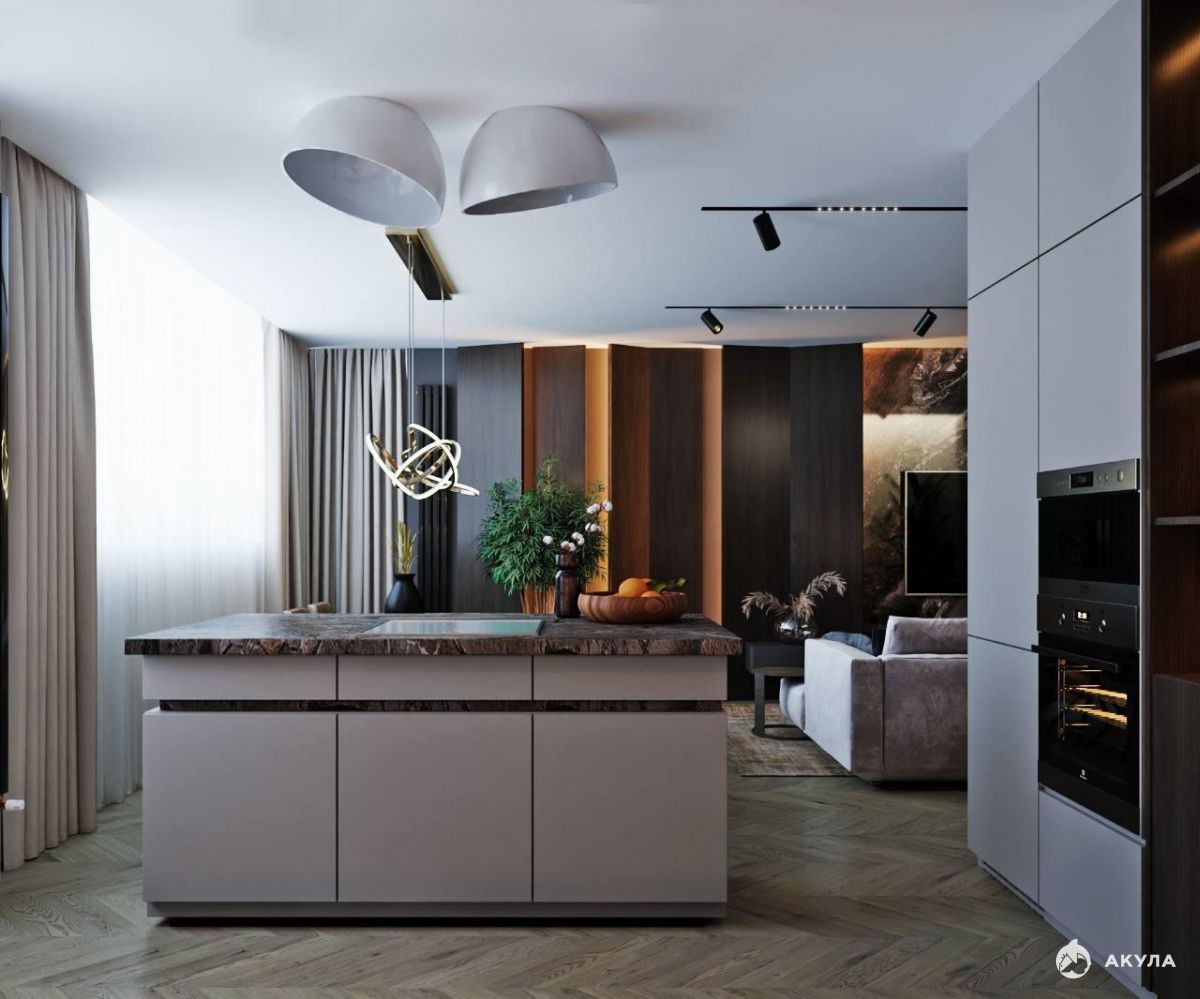 Кухня-гостиная оборудована встроенной техникой, а специально спроектированный кухонный остров с электроплитой дополнен большим обеденным столом, что создаёт прекрасное пространство для общения и угощений.