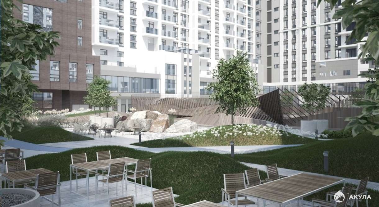 - Небесный парк с бассейном и шезлонгами на кровле жилого дома;