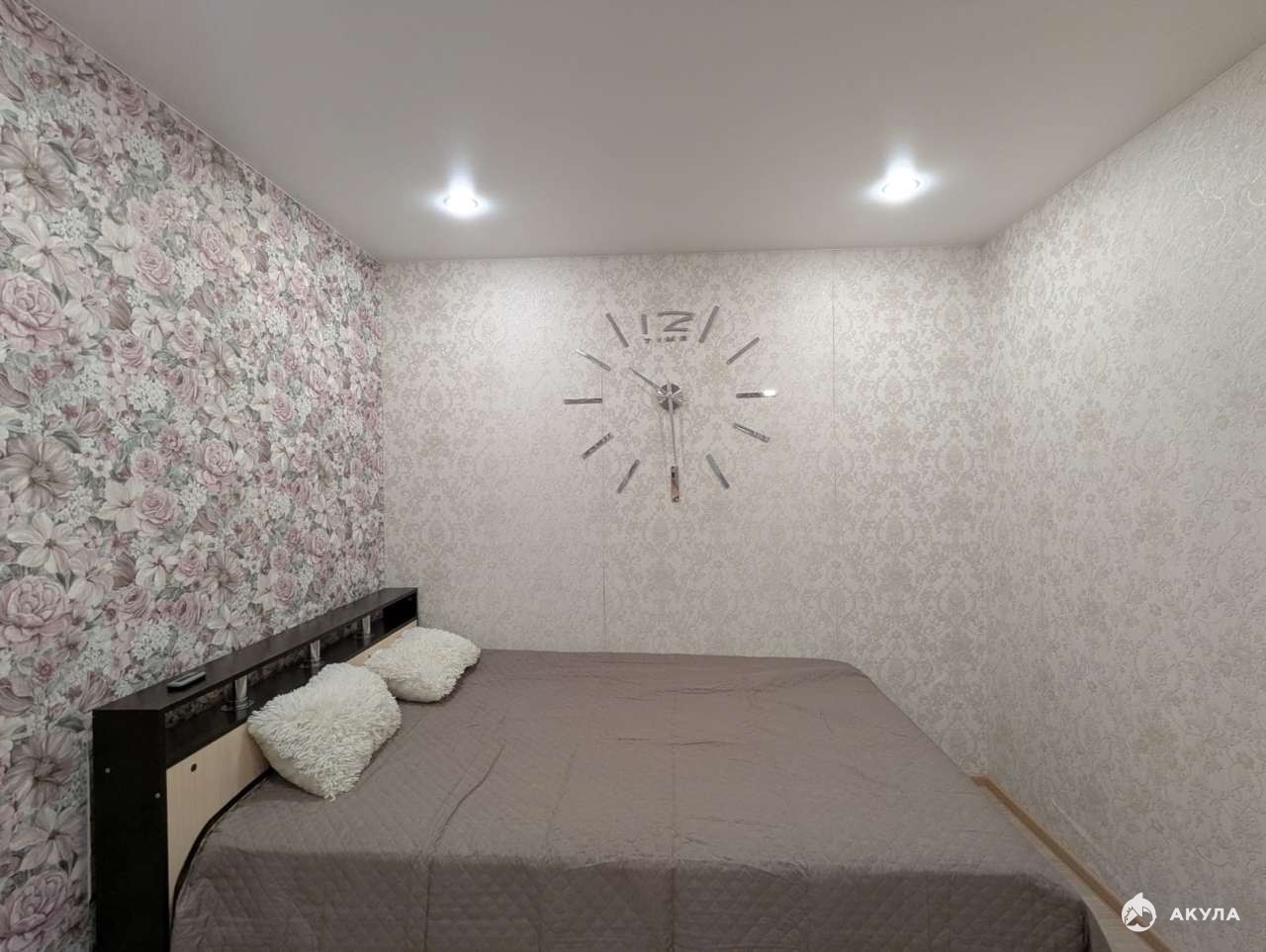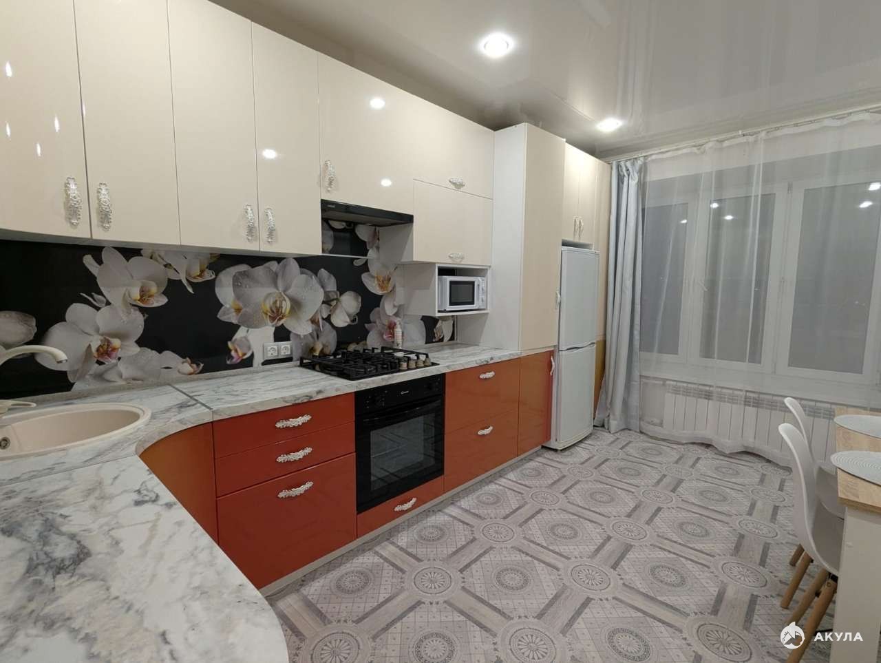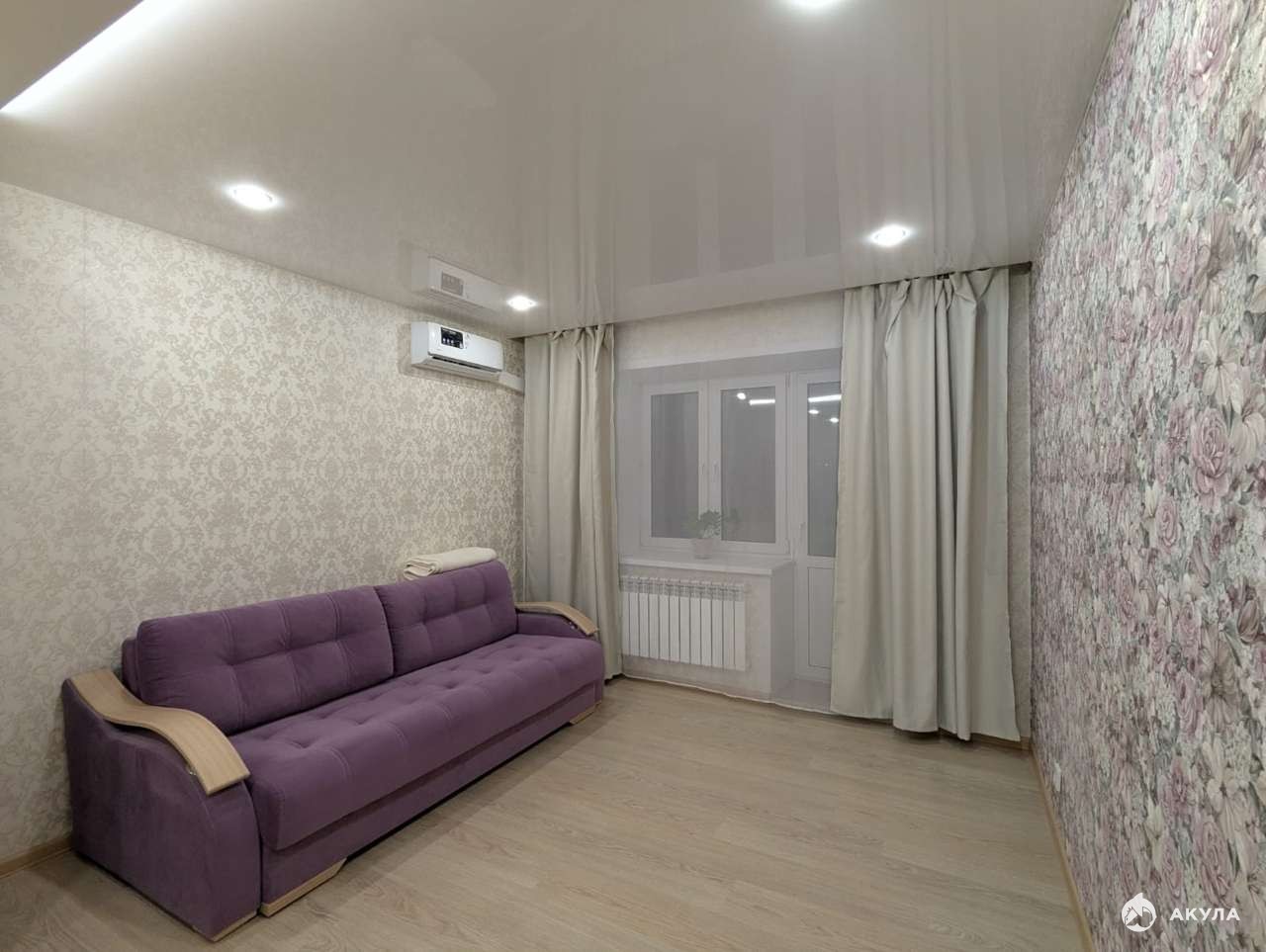 Комната разделена на две зоны: зону спальни (кровать) и зону отдыха (диван). В комнате установлена светодиодная лента. Включает разные области освещения в комнате. Очень теплая квартира. В наличии бытовая техника (холодильник, микроволновая печь, посудомоечная машина, газовая варочная панель, духовой электрический шкаф, стиральная машина).