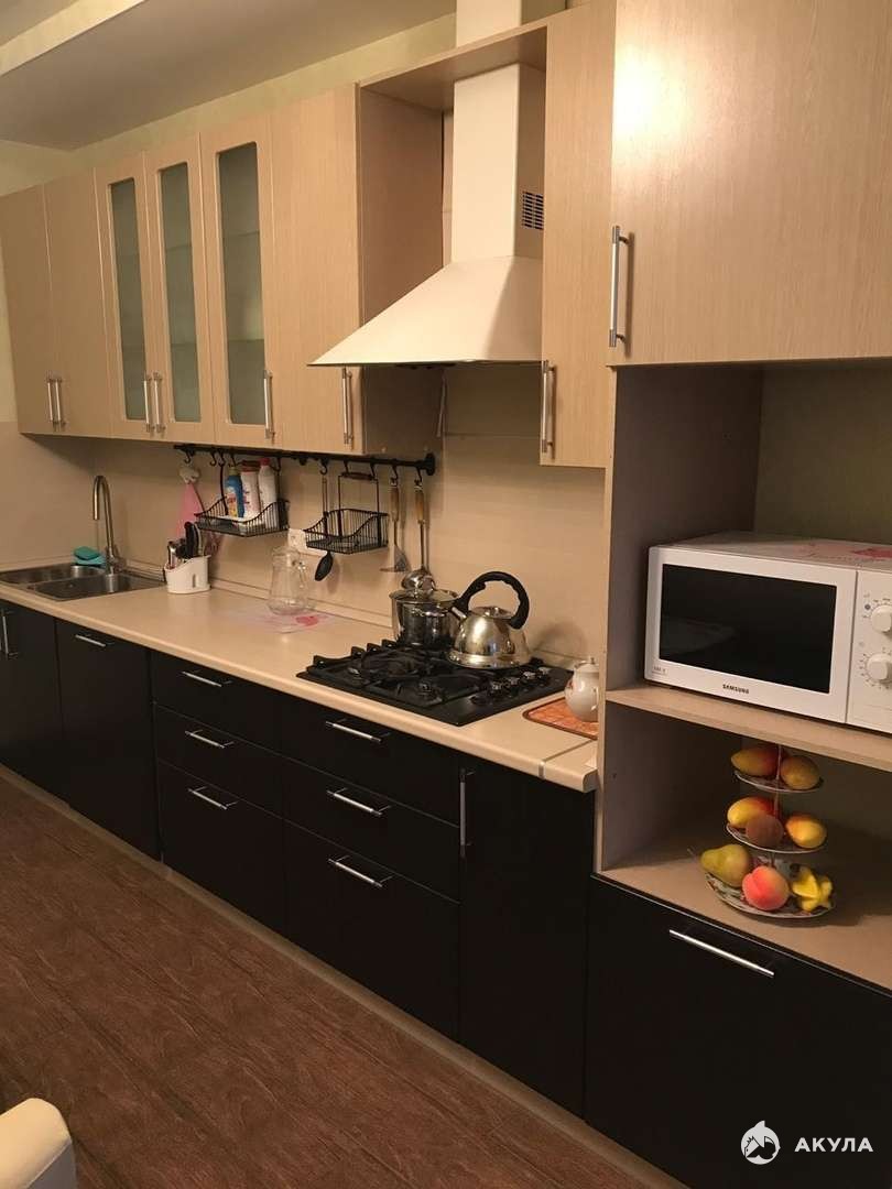 В квартире полностью обустроена мебель и техника. Стоит диван раскладной, шкаф для вещей, книжные полочки, комод, телевизор плазменный, кондиционер, кухонный гарнитур новый, плита с духовкой, холодильник, микроволновка, вытяжка, чайник, посуда для еды необходимая.
