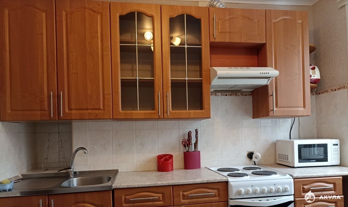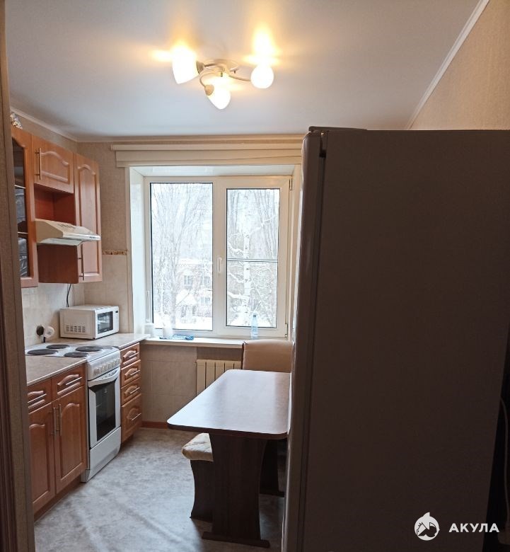 двухкомнатная, на две стороны. кухонный гарнитур, холодильник, микроволновка. в комнатах диваны, стулья, шкафы, комоды. во дворе детский сад и школа. с другой стороны сквер.