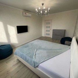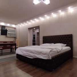 Сдаётся просторная квартира студия.В которой находится большая кожаная двухспальная кровать с ортопедическим матрасом , телевизионная зона с WI-FI роутером и телевизором со смарт ТВ, горка в виде мебельных модулей для хранения вещей, встраиваемая кухня со всей необходимой...
